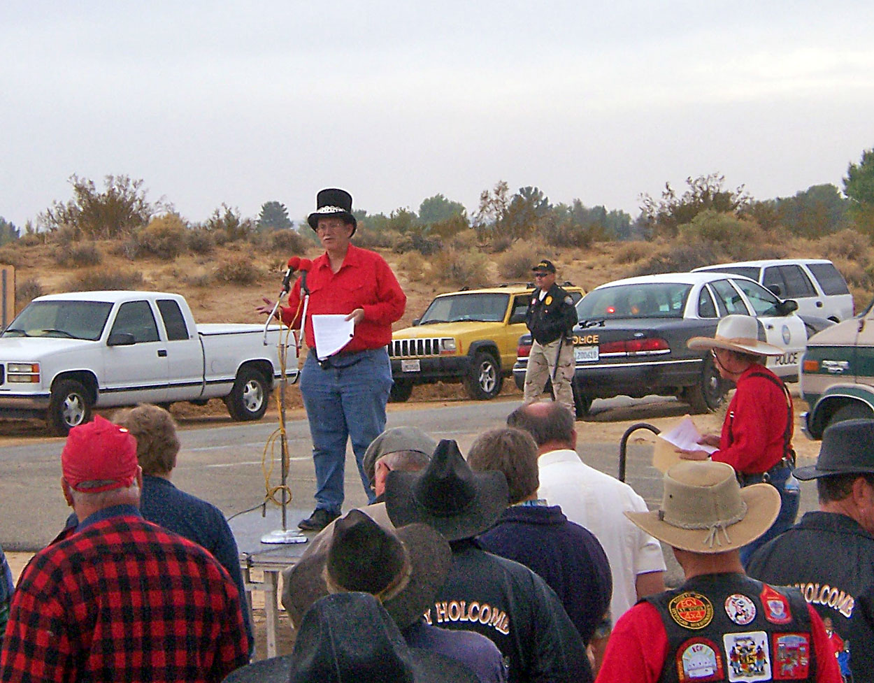 Rain and wind threatened but the assembled bunch stood its ground. There were many local dignitaries in attendance including Dr. Larry Adams, the mayor of California City; Bill Way, its city manager, and several members of the city council. The colors were presented by presiding PXL Humbug Paul "PPA" Weaver and the five Humbugs of the Southern Alliance, and much help was provided by the Girl Scouts from Cal City's Troop 180.