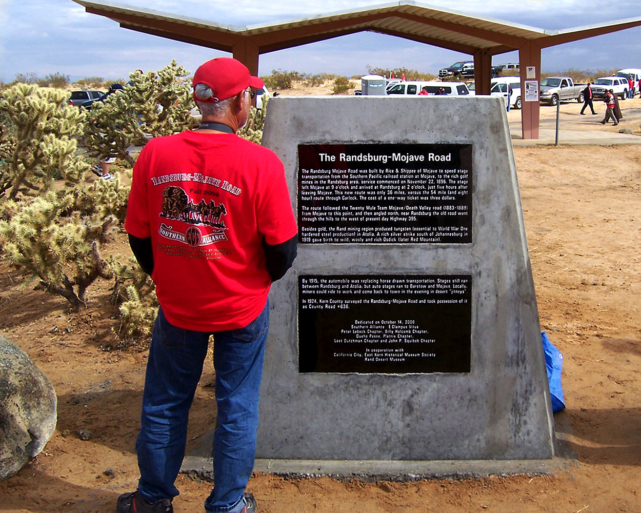 Our October 14, 2006, erection celebrates the 1896 construction of the Randsburg-Mojave Road. This monument is composed of two polished black marble plaques set within a five-foot tall concrete trapezoid. It stands just east of California City where the two legs of the Randsburg-Mojave Road came together. Its GPS coordinates are 35°08'24.98" N, 117°55'28.98" W.