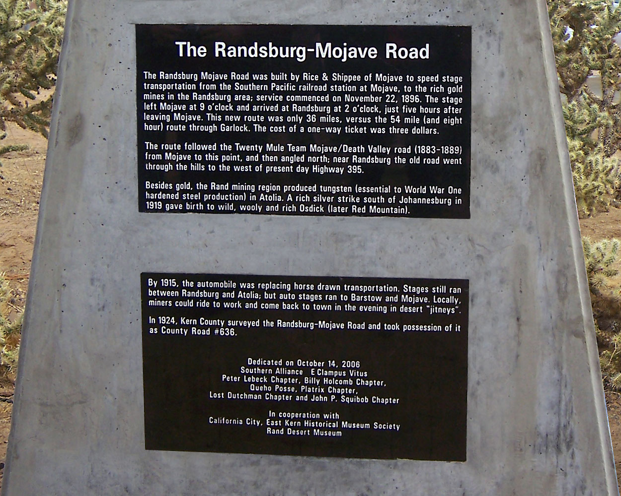 In 1896, Mojave based Rice & Shipee built the new Randsburg-Mojave Road directly linking the Rand Mining District to the town of Mojave and to its Southern Pacific railhead. In building the road, Rice & Shipee used that stretch of the 20 Mule Team trail that lead northeast from Mojave into California City, then added a new leg northeast from California City into Randsburg. The Randsburg-Mojave Road meant travel in almost a straight line.